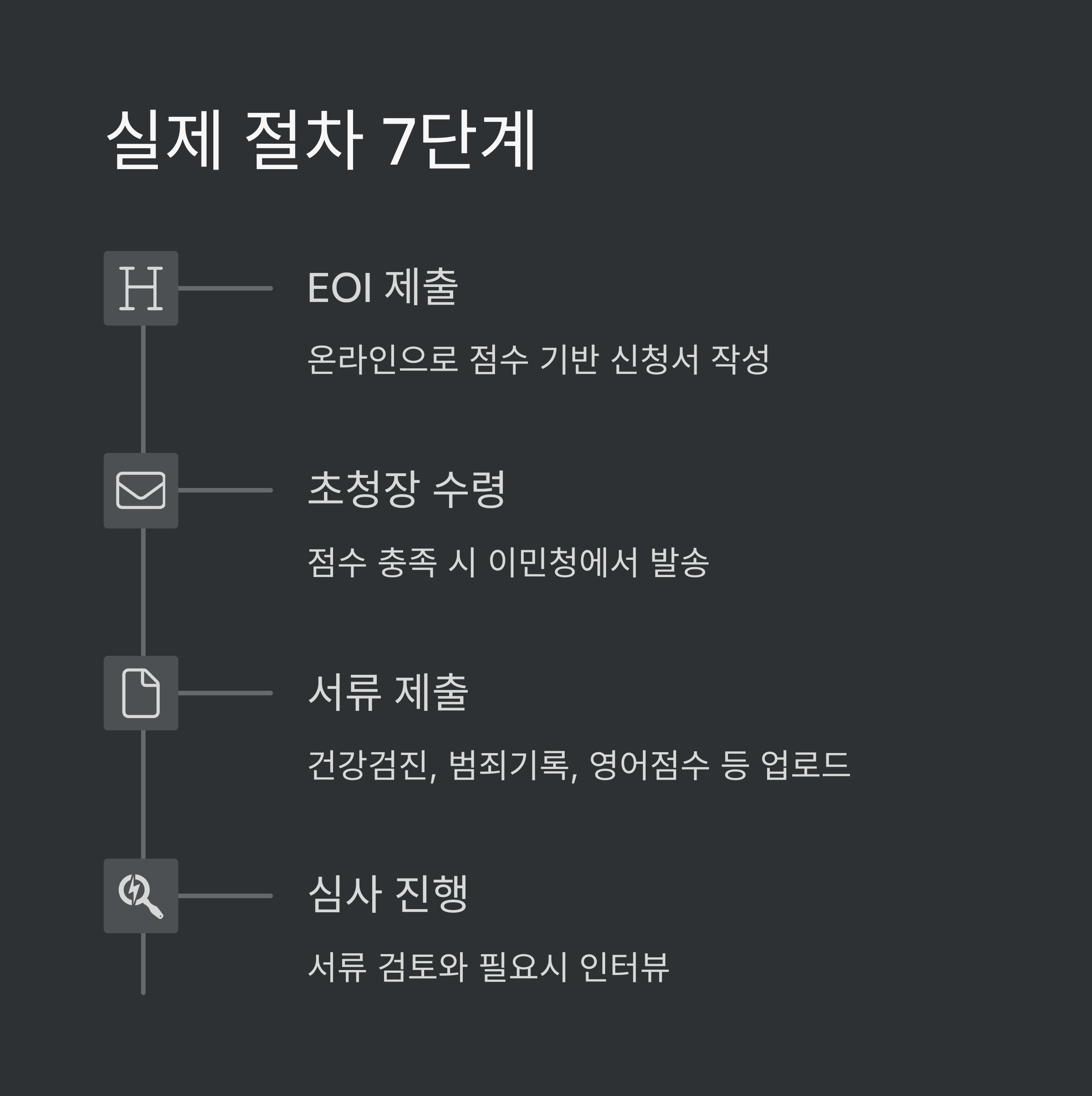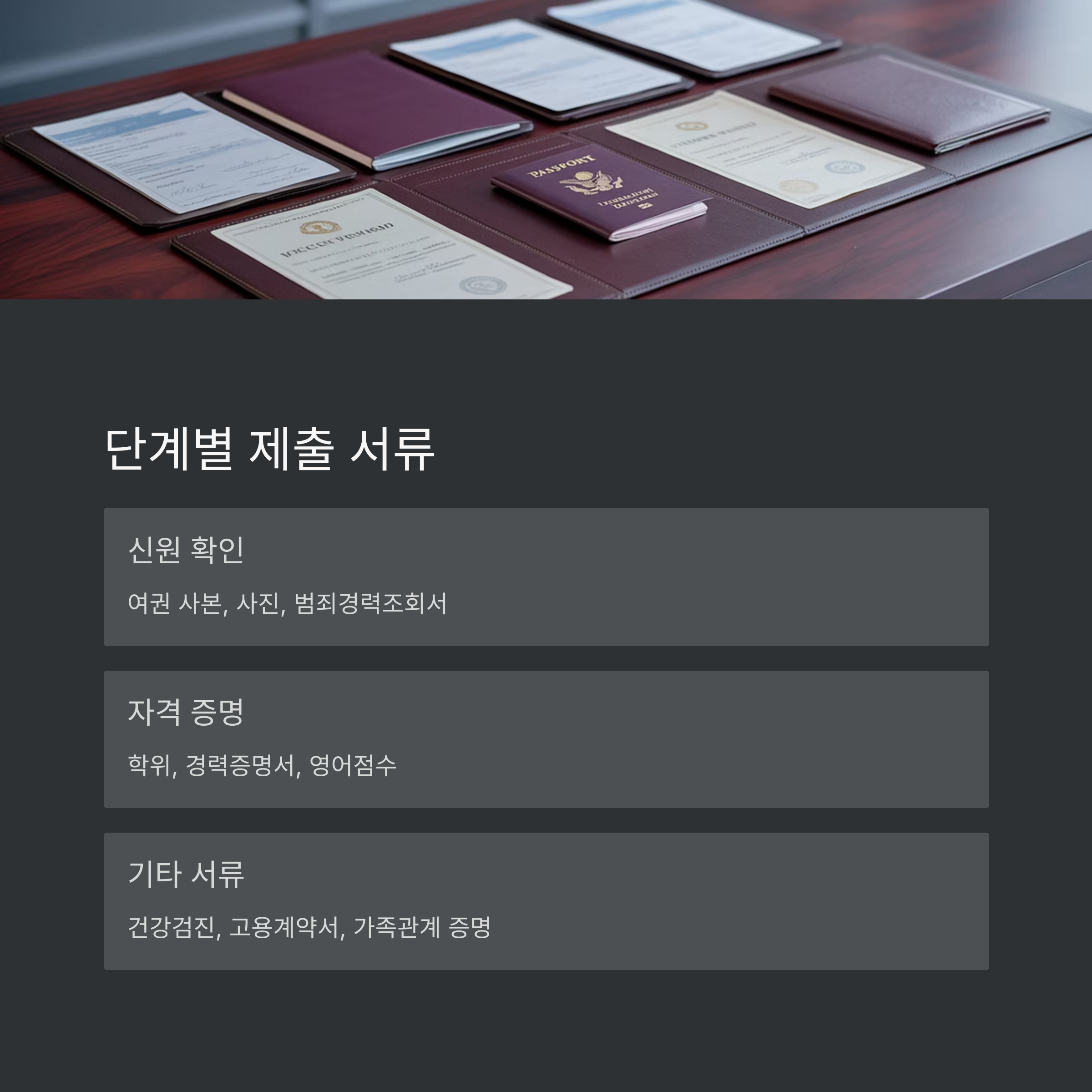 - 3️⃣ 서류 준비 및 제출 – 건강검진, 범죄기록, 영어점수 등 서류 업로드
