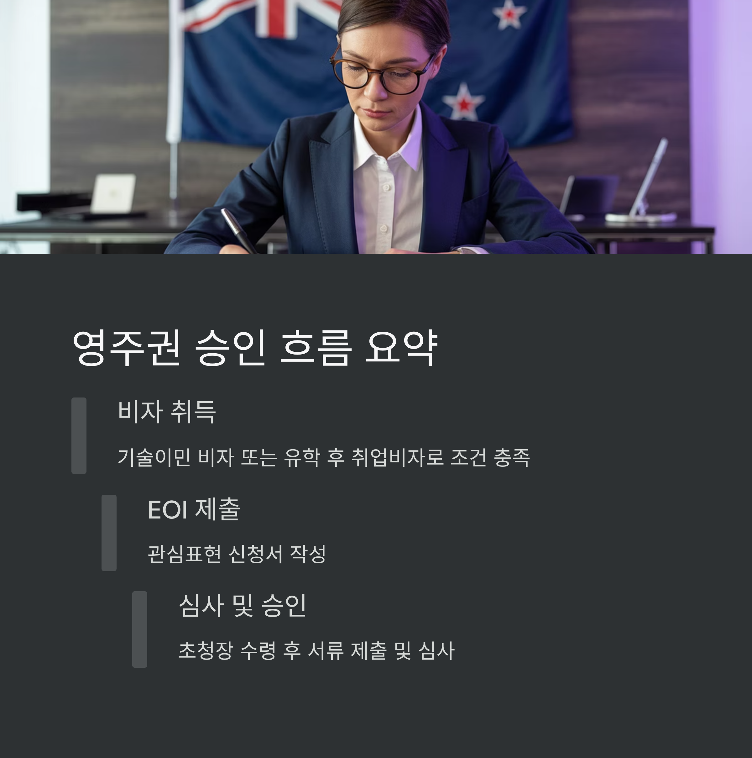 초기에는 기술이민 비자 또는 유학 후 취업비자를 통해 조건을 채우고, 이후 'EOI → Invitation to Apply → 영주권 심사 → 승인'이라는 절차로 이어져요.