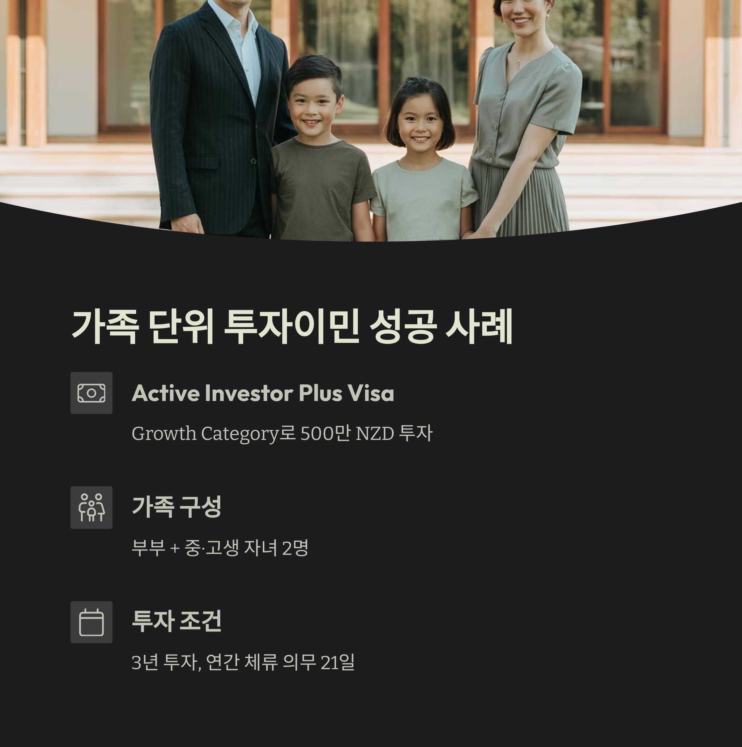 C씨 가족은 2025년 4월 1일부터 적용된 Active Investor Plus Visa 개편 덕분에 Growth Category로 500만 NZD(약 3억 원)만 투자해 전원 영주권을 획득했어요. 영어 요건도 사라져, 세무·법률 자문에 집중할 수 있었죠.:contentReference[oaicite:2]{index=2}