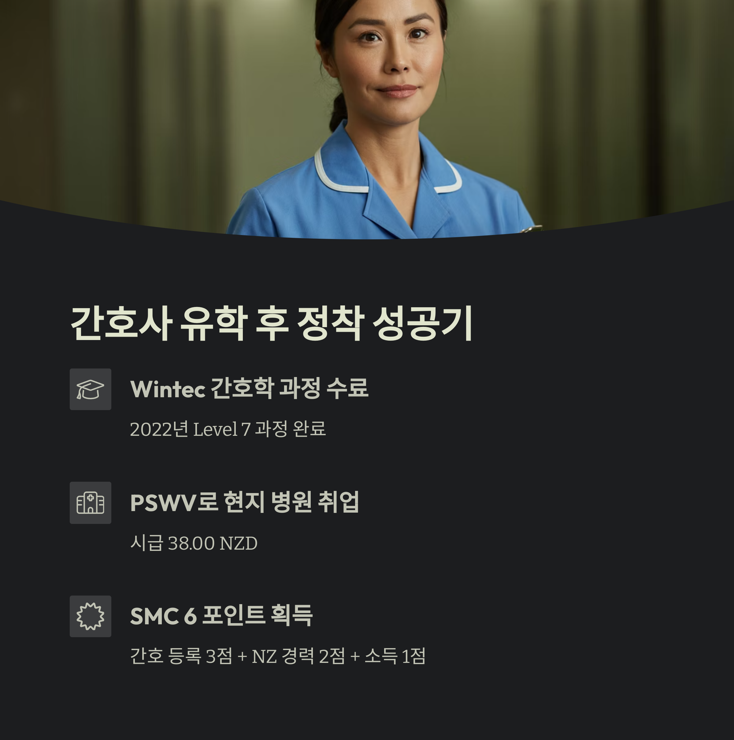 ✔ 비자 흐름: 학생 → PSWV(3년) → SMC 6 Points(간호 등록 3점 + NZ 경력 2점 + 소득 1점)