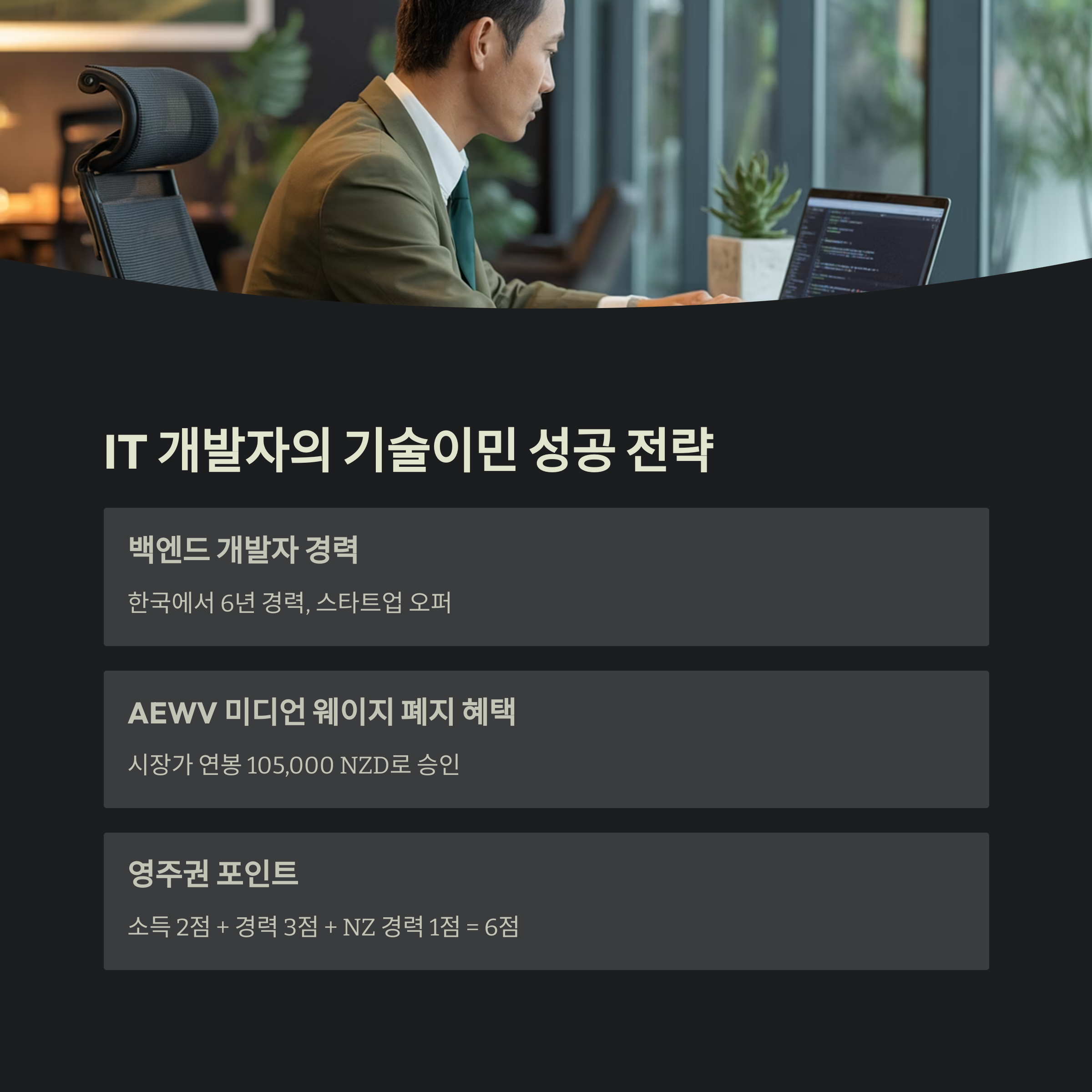 B씨는 한국에서 6년차 백엔드 개발자였고, 2024년 말 뉴질랜드 스타트업의 Accredited Employer 오퍼를 받았어요. 2025년 3월부터 AEWV의 미디언 웨이지(31.61 NZD) 폐지가 적용돼, 시장가 연봉 105,000 NZD만으로 기술이민 승인을 받았답니다.:contentReference[oaicite:1]{index=1}