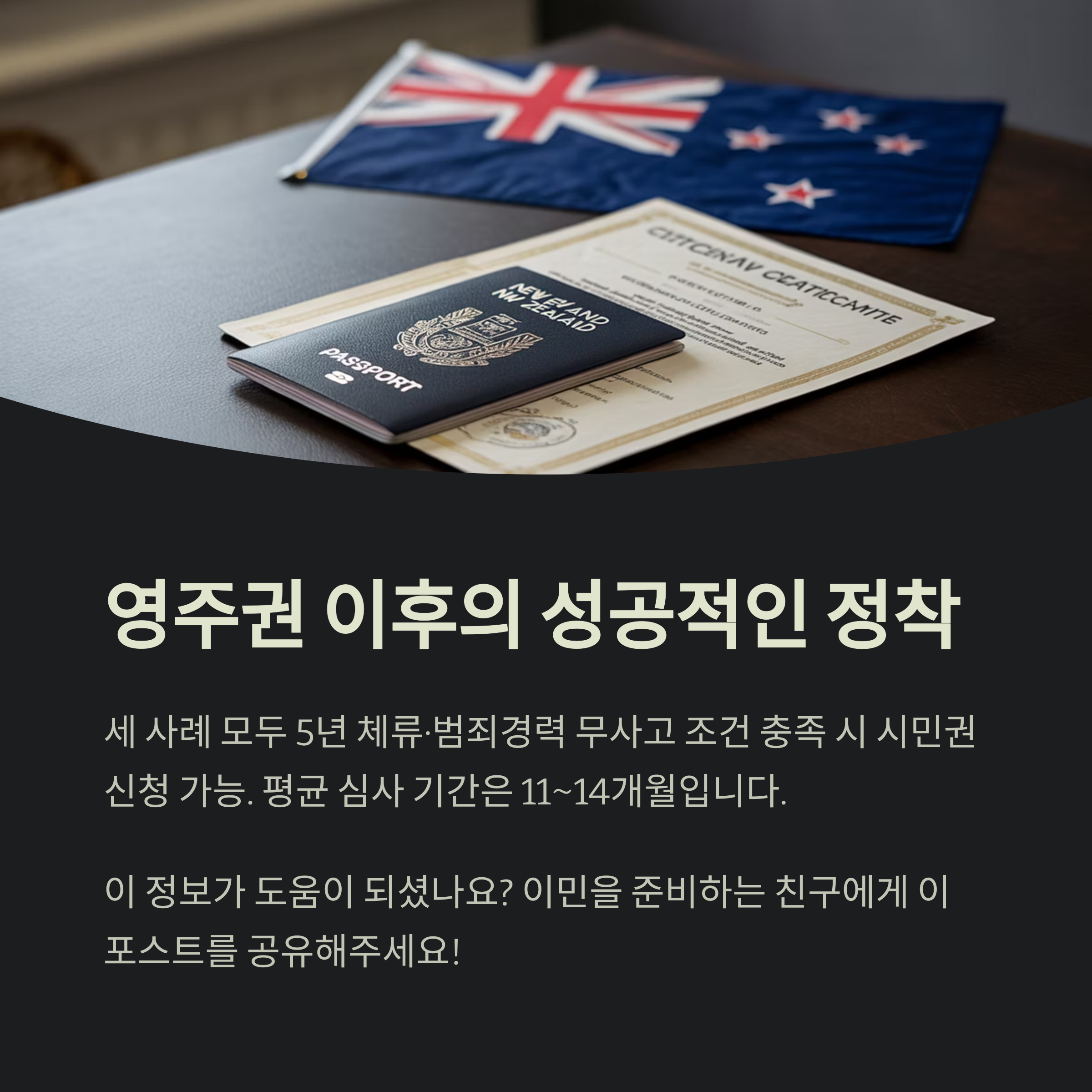 세 사례 모두 영주권 후 5년 체류·범죄경력 무사고 조건을 충족하면 시민권 신청이 가능해요. 2025년 기준, 평균 심사 기간은 11~14개월이니 미리 서류(여권, 경찰증명, 출입국 기록)를 확보하면 좋아요.