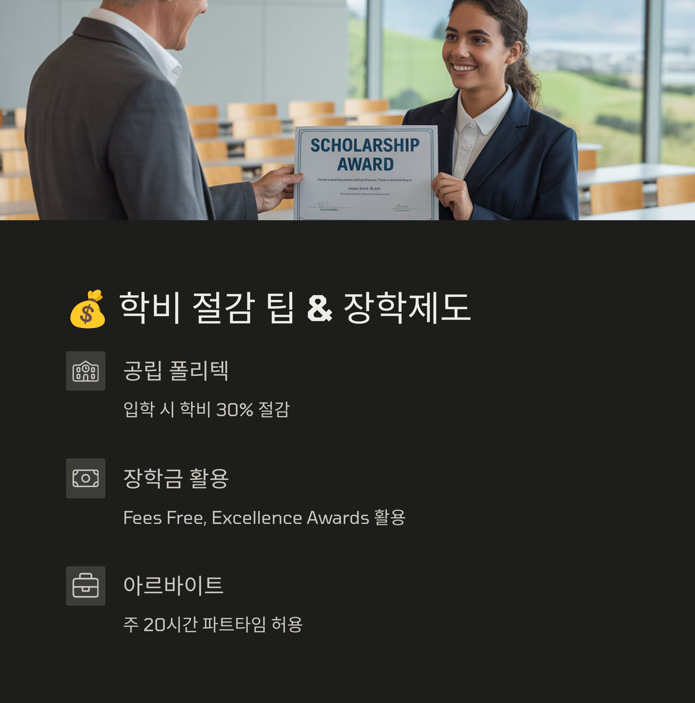 - 🪙 현지 장학금(Fees Free, Excellence Awards) 활용