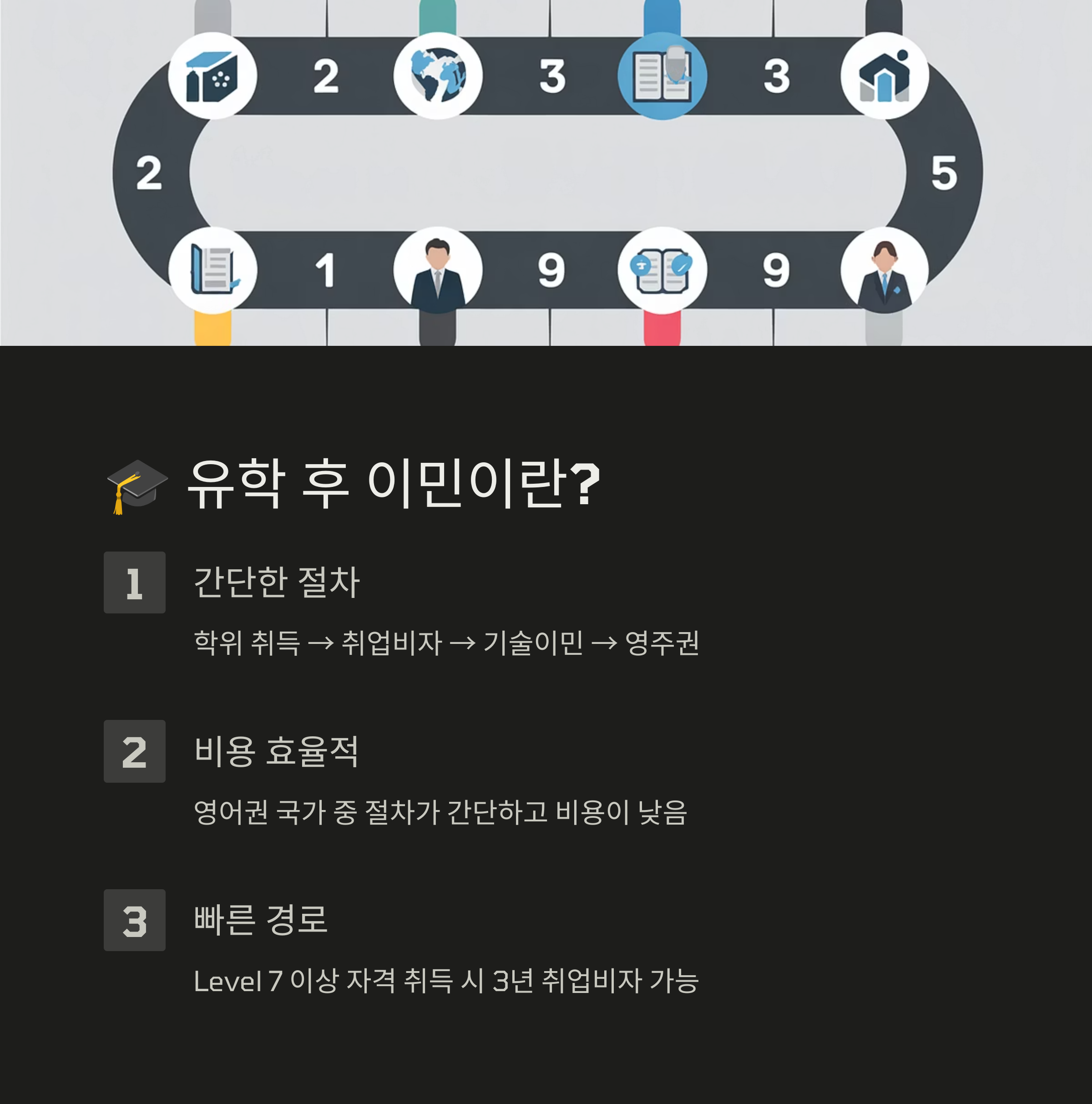 학위 취득 → 취업비자(Post-study work visa) → 기술이민 전환 → 영주권 신청이라는 순서로 이어져요. 이 루트는 영어권 국가 중에서 절차가 간단하고 비용이 비교적 낮아 인기 있는 편이에요.