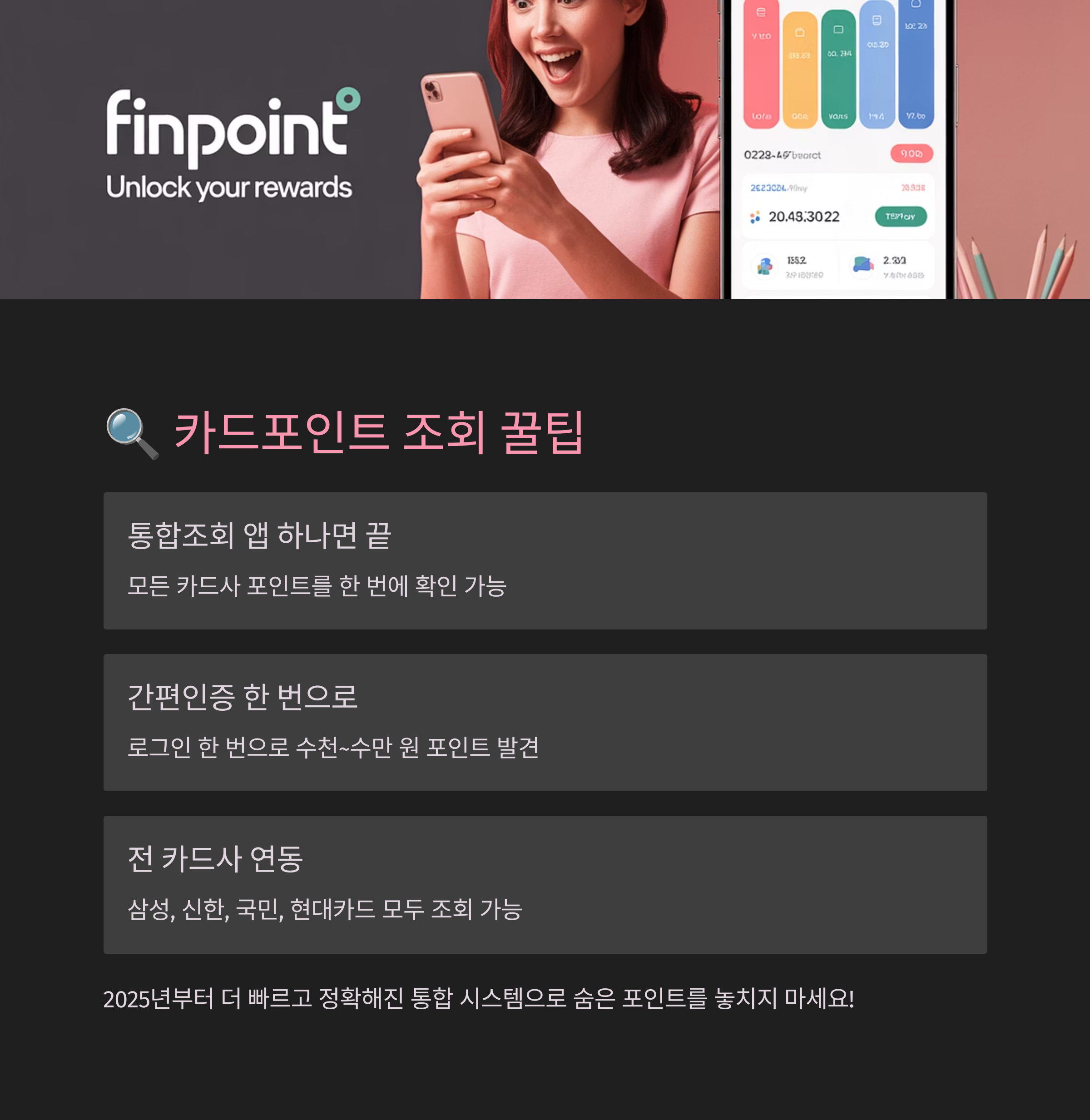 요즘은 앱 하나만 설치하면 전 카드사의 포인트를 **통합으로 단번에 확인**할 수 있어요. 바로 '카드포인트 통합조회 앱'이죠.