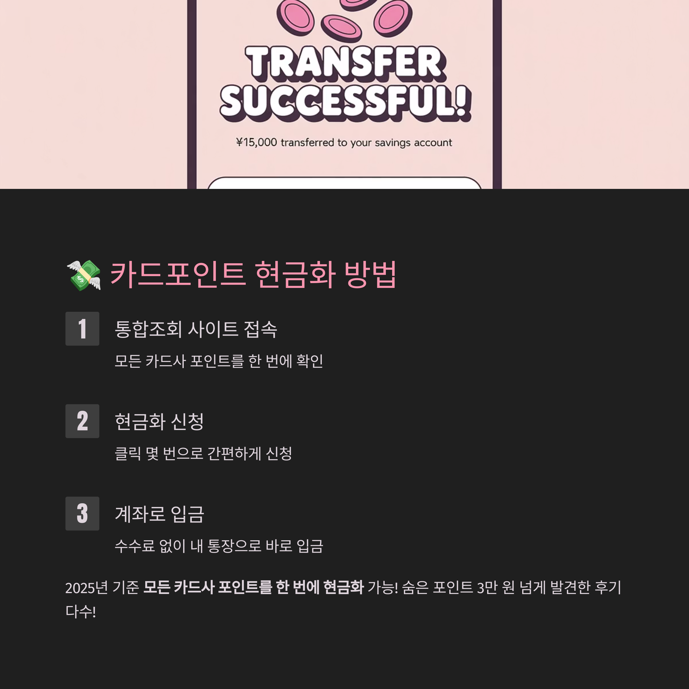 ✅ 이미지 예시: 카드사 포인트 현금 전환 화면, 계좌로 입금된 내역 캡처, 사용자 인증 후기
