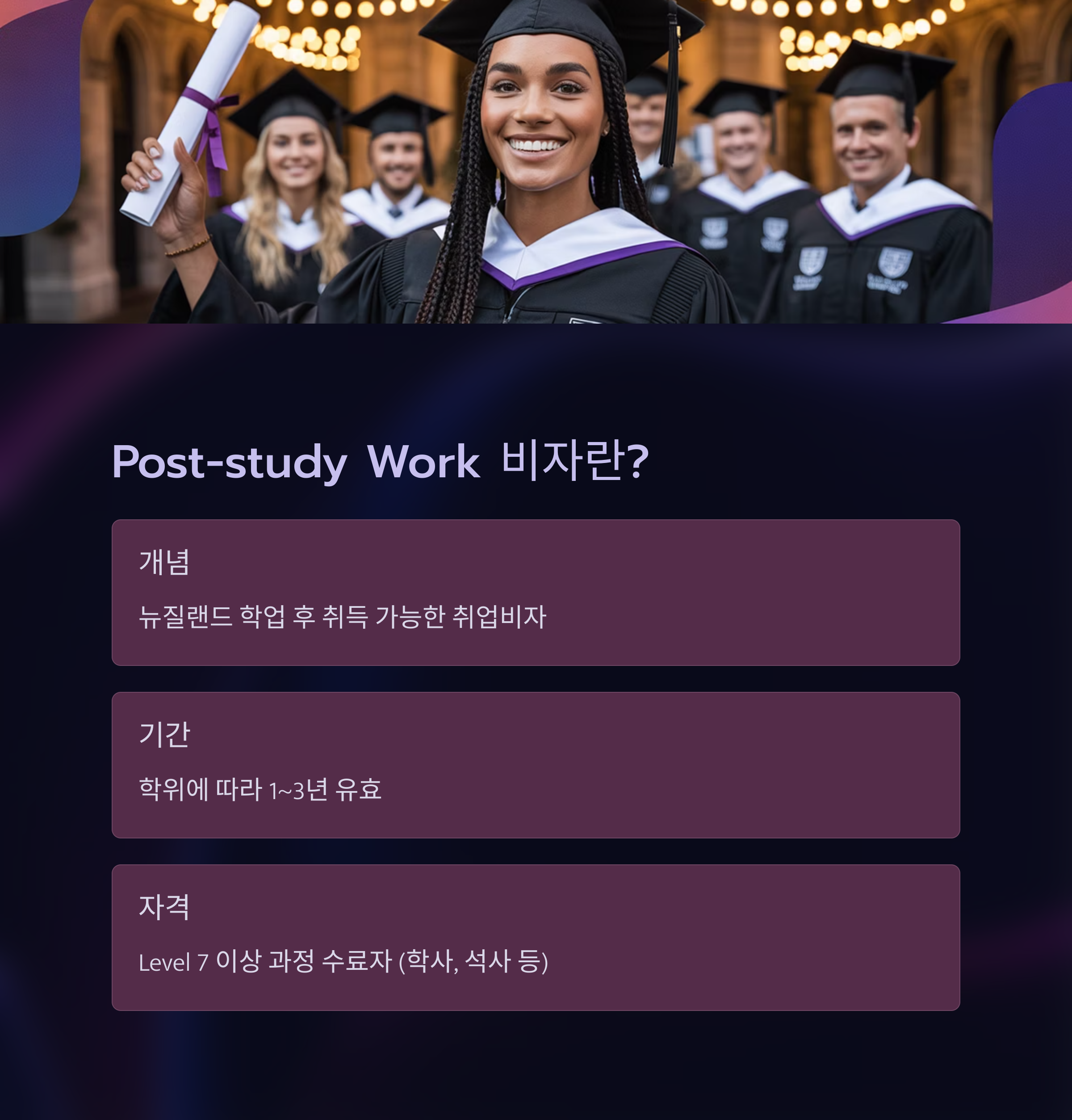 Post-study Work 비자는 뉴질랜드에서 학업을 마친 유학생에게 주어지는 취업비자예요. 이 비자는 학위 수준에 따라 1~3년 동안 유효하며, 해당 기간 동안 자유롭게 일할 수 있어요.