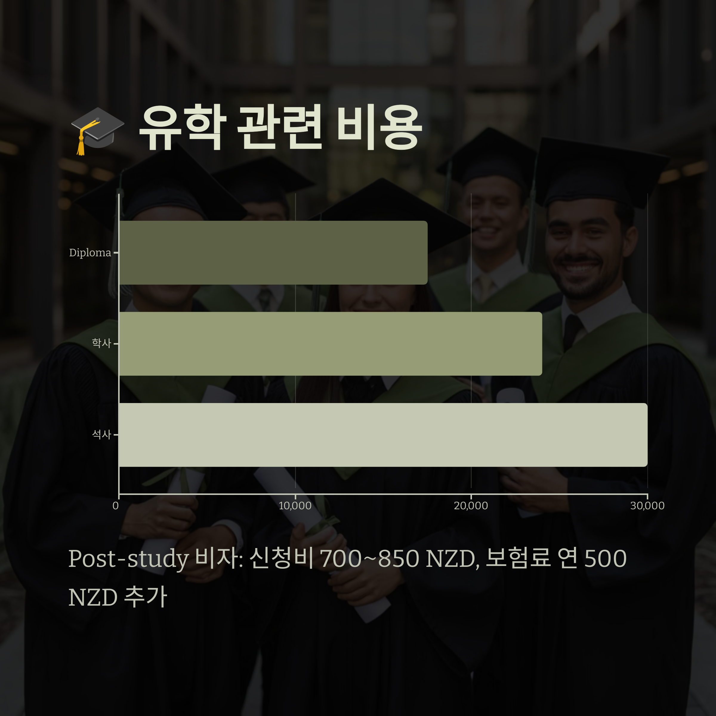 Post-study Work 비자 신청 시에는 별도 신청비(700~850 NZD), 보험료(연간 약 500 NZD), 생계비 증빙도 필요해요.