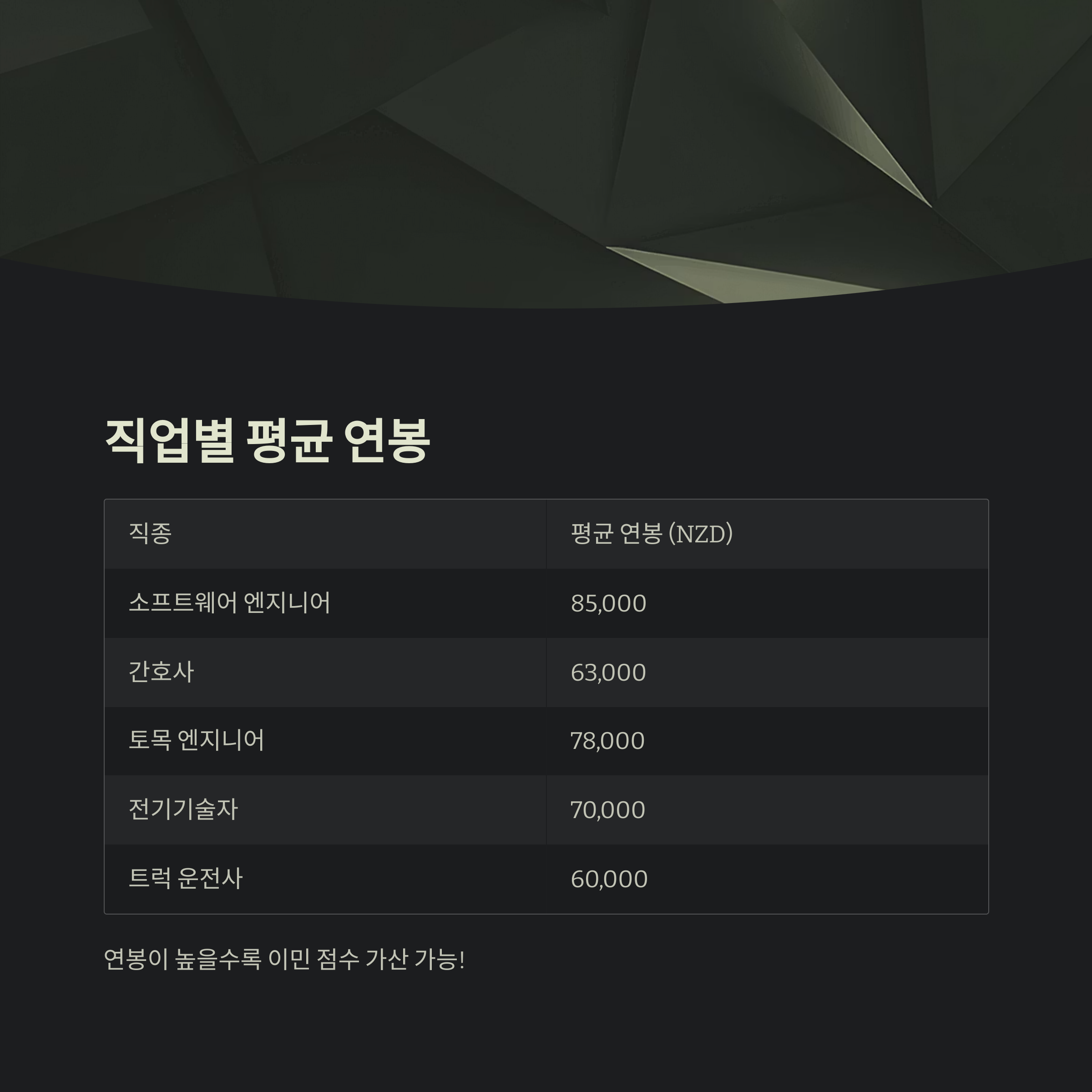 | 직종 | 평균 연봉 (NZD) | 추가점수 가능 여부 |