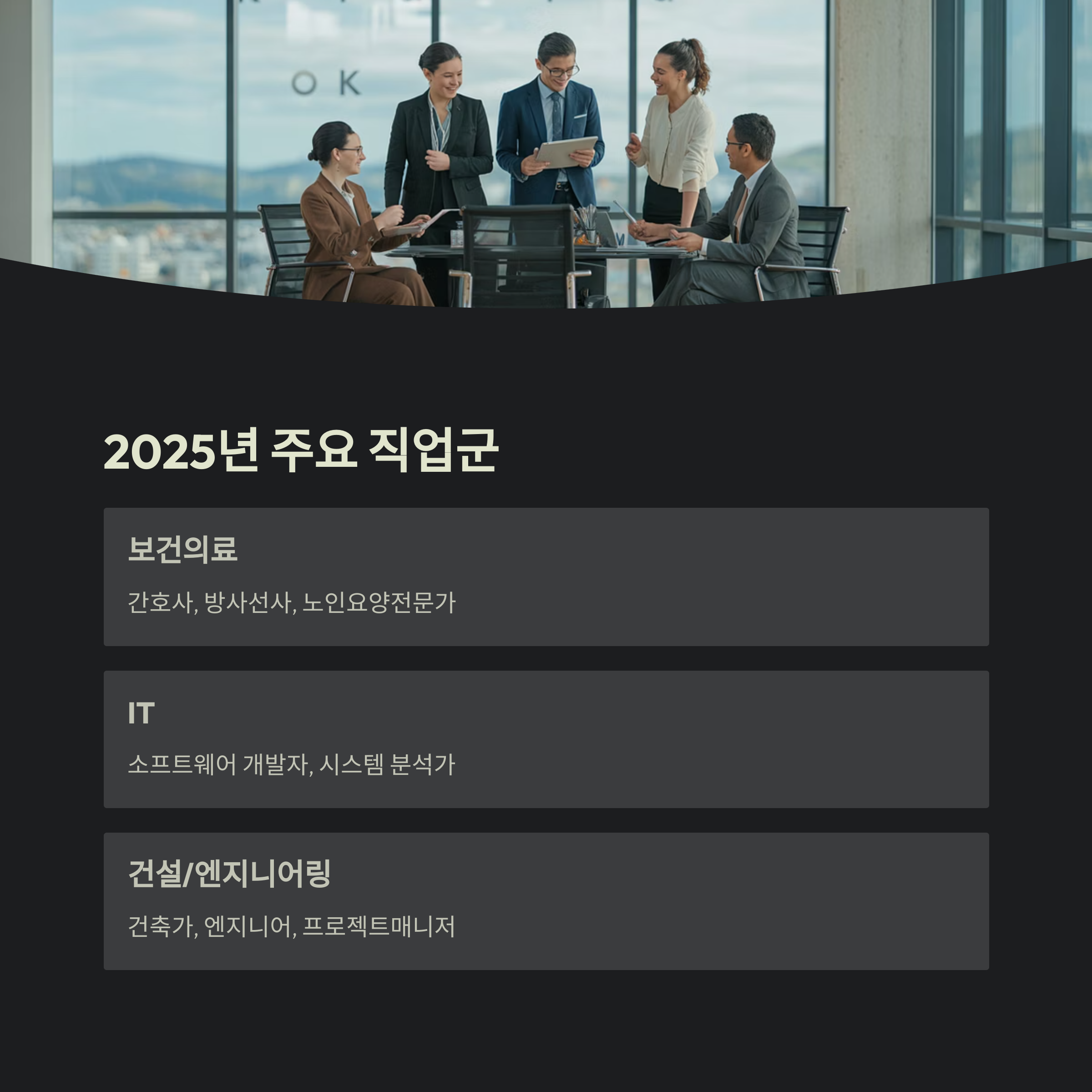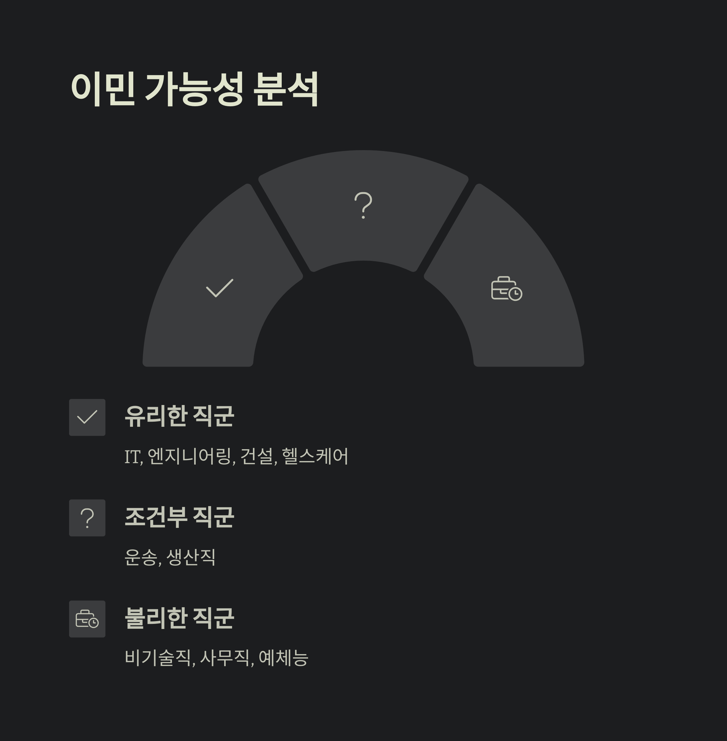 🟢 유리한 직군: IT, 엔지니어링, 건설, 헬스케어 🟡 조건부 직군: 운송, 생산직 🔴 불리한 직군: 비기술직, 사무직, 예체능